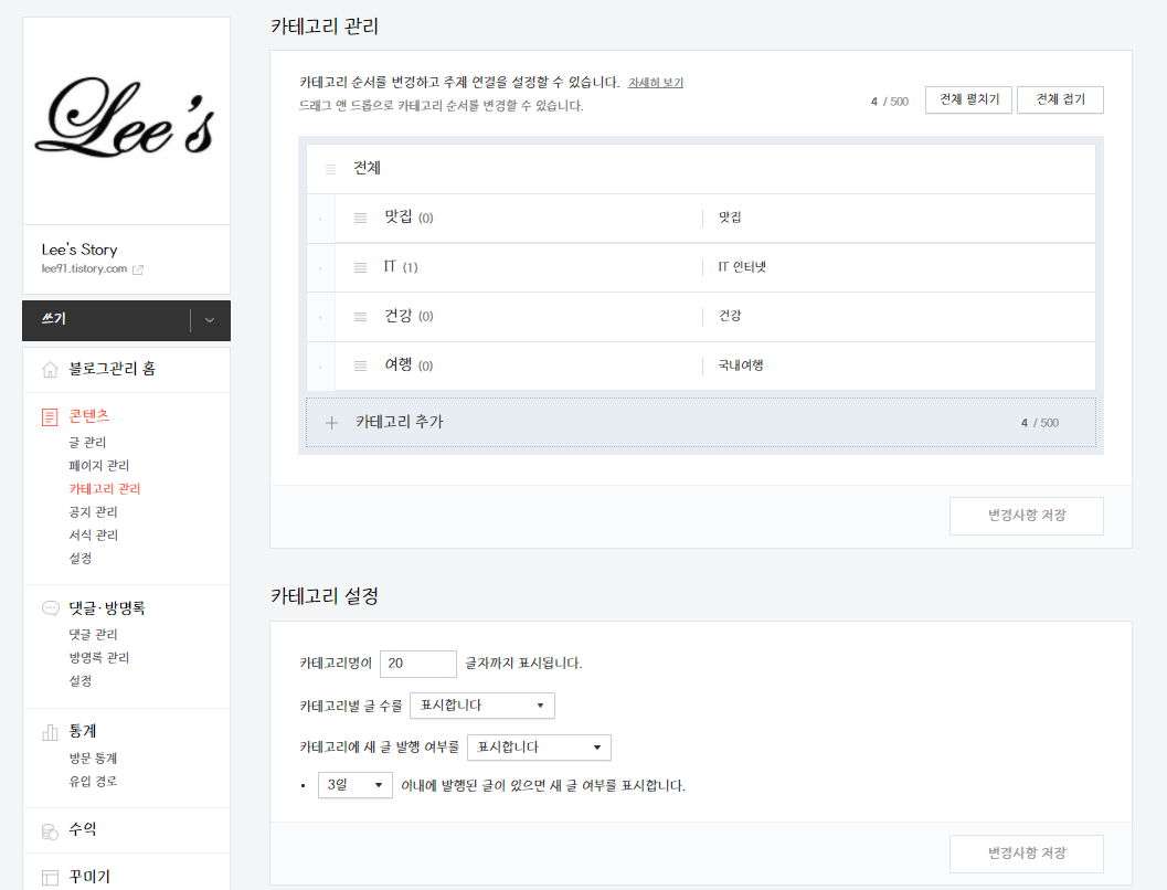 아래 사진에는 이미 구성된 사진이고 맨 처음 카테고리는 기본적으로 한 가지만 있을 것이고 카테고리 추가로 수정해주시면 됩니다.