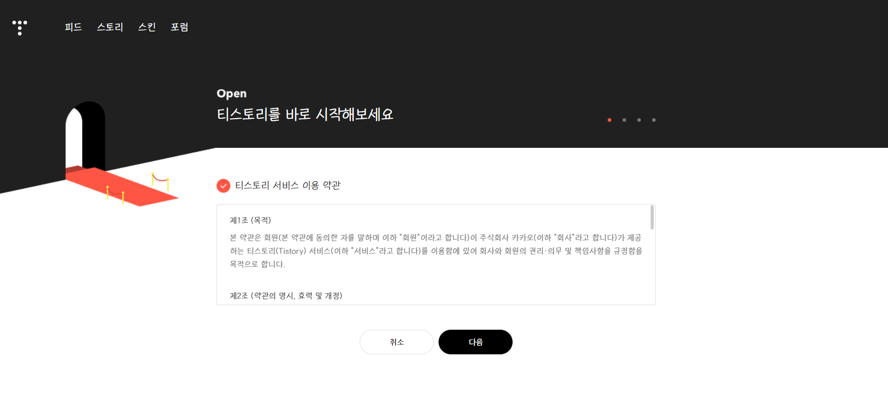 카카오계정 또는 티스토리계정 로그인하게 되면 티스토리 서비스 이용 약관 페이지가 나오고 약관 체크해주시고 다음 버튼을 클릭해줍니다.