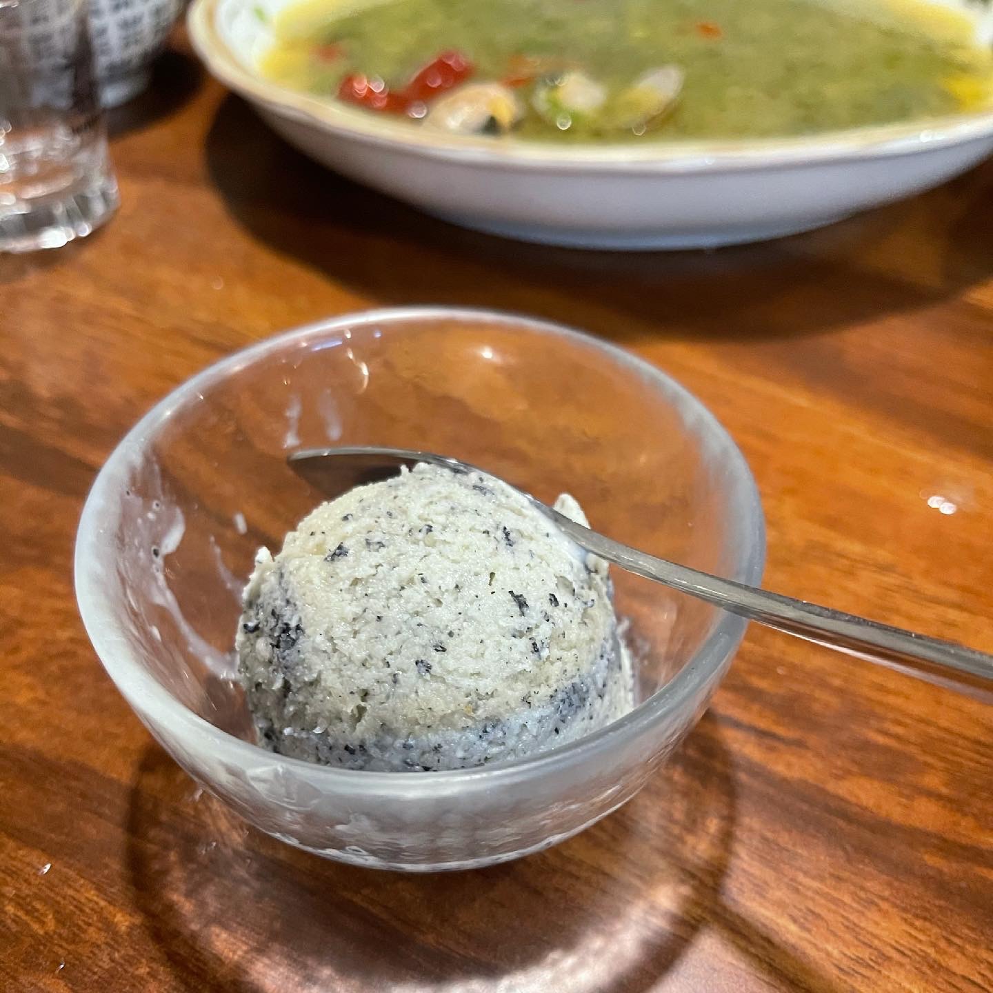 어느 정도 먹고 일어날 분위기가 되었을 때쯤, 서비스로 흑임자 아이스크림을 준비해주셨는데 처음에는 우리만 주는 줄 알고 감동 먹었다가 주위를 둘러보니 다들 한입씩 하고 있었다...ㅎㅎ