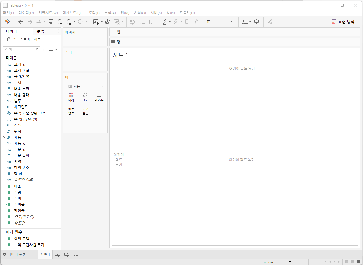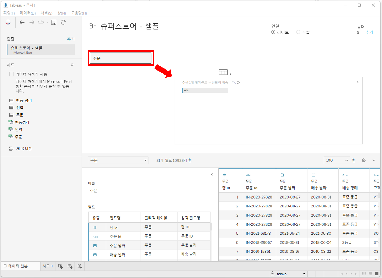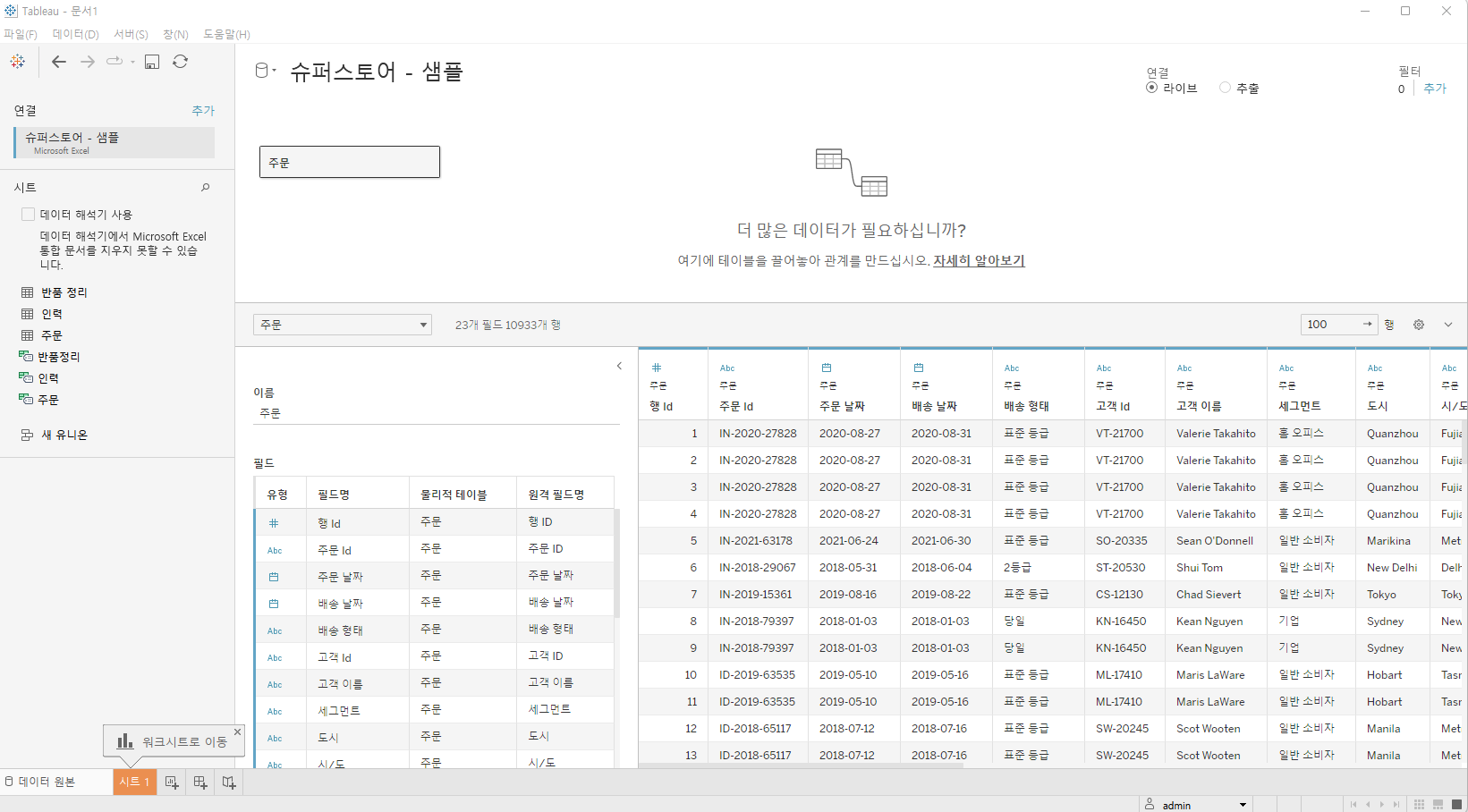 기본적으로 데이터 테이블을 하나만 사용한다고 하면, 좌측 사이드 바 쪽에서 시트라는 부분의 리스트 중 필요한 테이블을 더블클릭 또는 Drag & Drop으로 "여기로 테이블 끌기" 공간에 배치합니다.