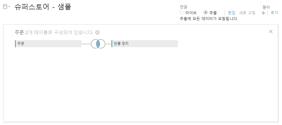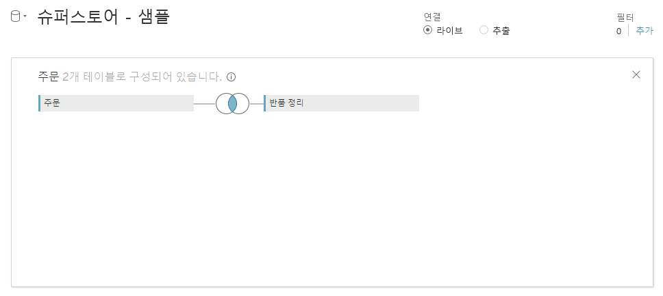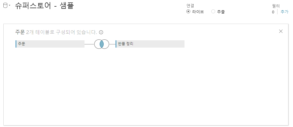 Tableau에서는 데이터 원본 작업 화면의 우측 상단 연결이라는 부분에서 작업을 할 수 있습니다.