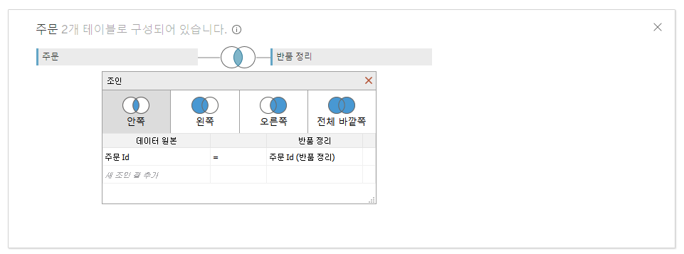 기본적으로 Inner Join이라는 형태로 구성되어 있으며, 가운데 다이어그램 모양을 클릭하면 다른 Join 형태나 Key 설정을 할 수 있습니다.