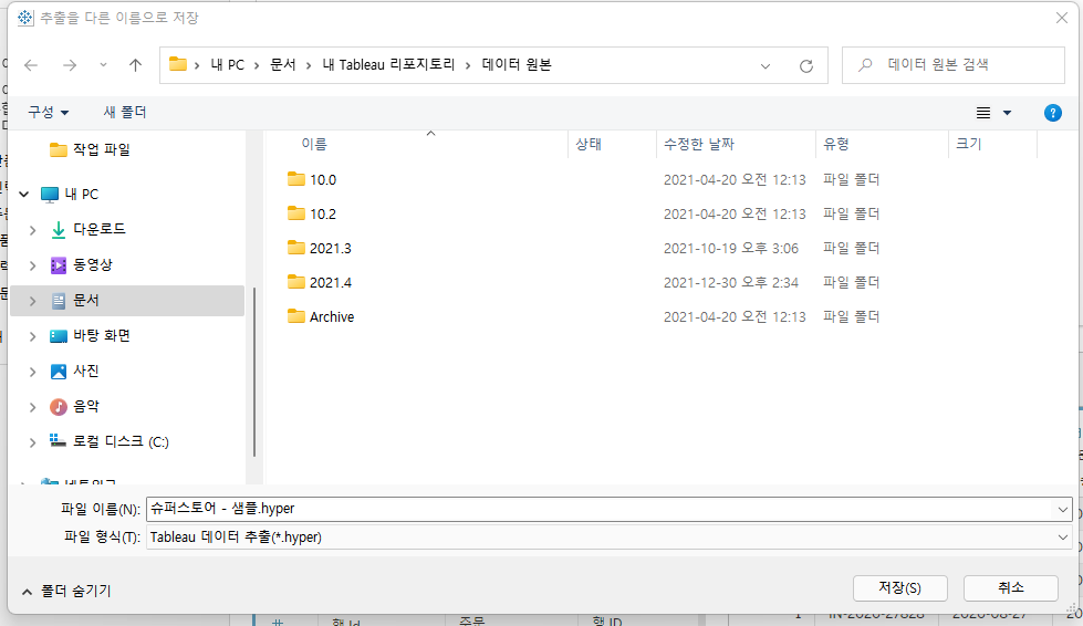 추출 선택 시 Hyper 형식의 파일을 저장해야 하며 저장 이후 작업공간에 올려둔 데이터를 바라보는 것이 아니라 저장된 Hyper 파일을 바라보게 됩니다.