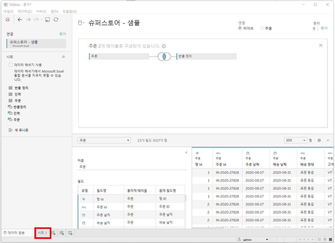 모든 Join 작업이 완료가 되면 좌측 하단에 시트 1을 클릭하여 워크시트로 이동합니다.